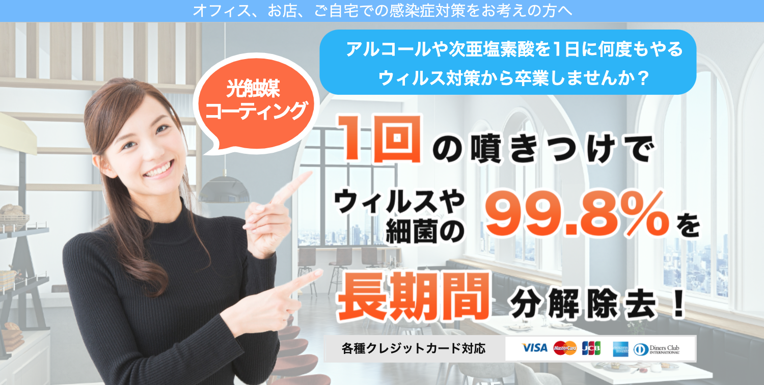 新型コロナウィルス感染拡大に伴い、新規事業として光触媒コーティングをスタートしました。一度施工することで、半永久的に感染症対策をすることができます。詳しくはこちらのwebサイトをご覧ください。