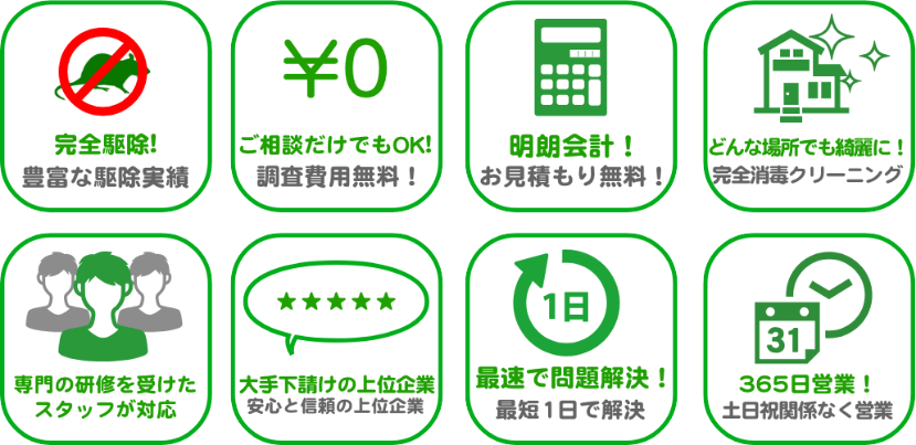 駆除ではもちろん徹底的に作業を行いますが、特に衛生面には気を使い、お伺いさせていただいた時より綺麗にして帰ります。